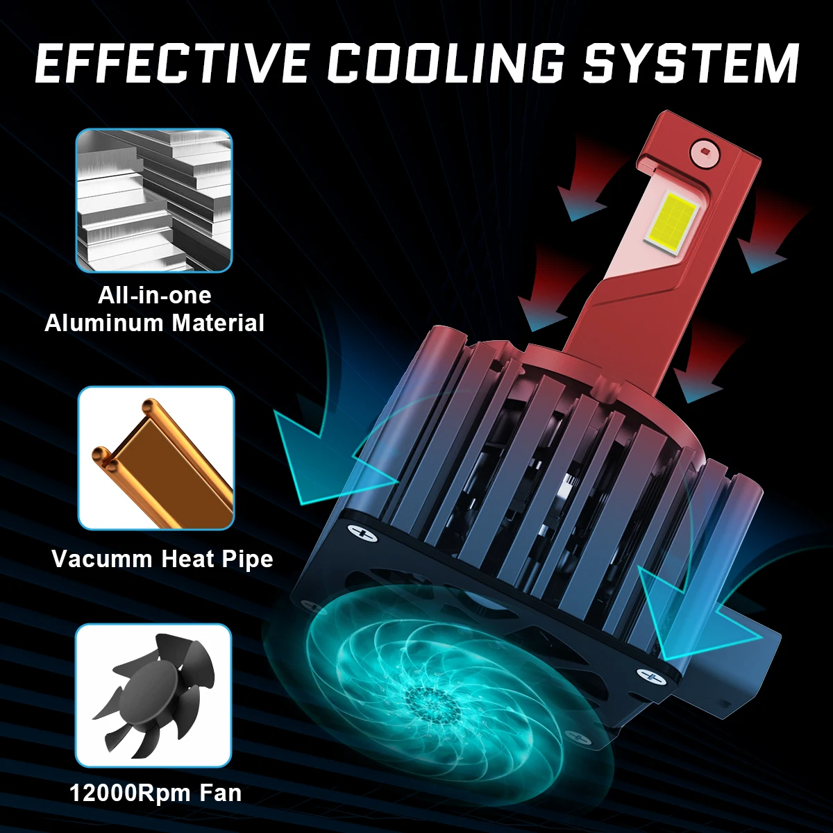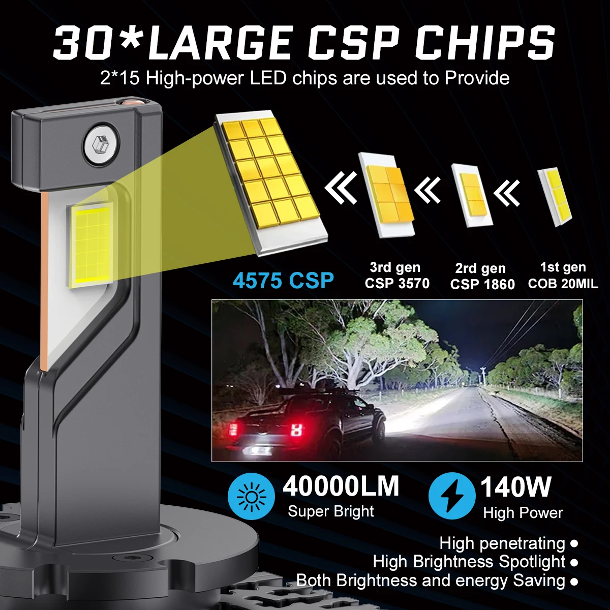 يمكن استخدامها كمصابيح أمامية أو مصابيح ضباب تعمل بجهد 12 فولت تيار مستمر، وهي مناسبة لسيارات القيادة على اليمين واليسار. مقاومة للماء والغبار بمعيار IP68.