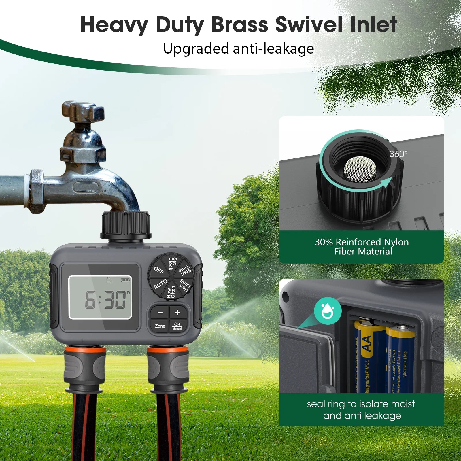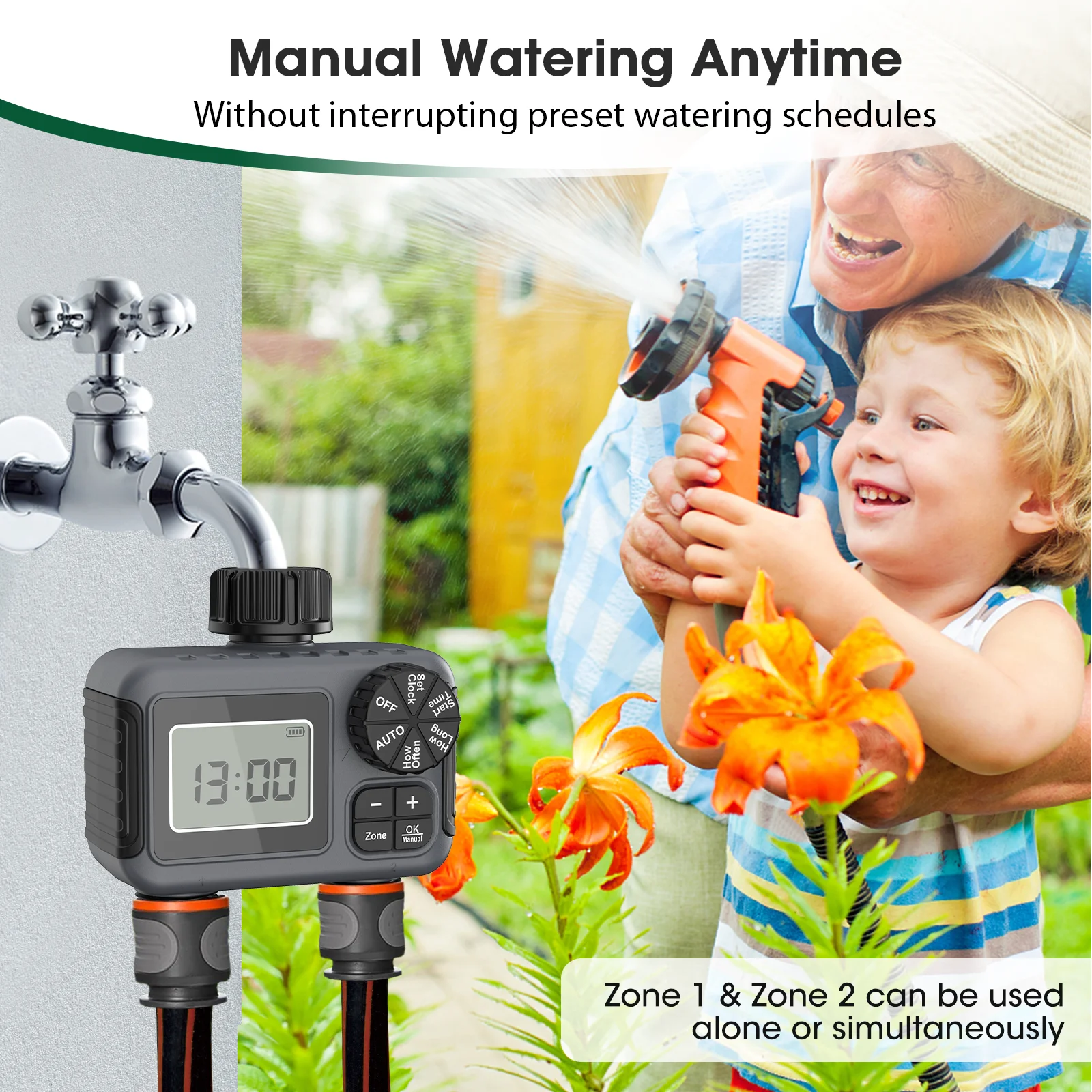 مؤقت رشاشات إنسوما ثنائي المناطق – مؤقت خرطوم قابل للبرمجة مع تأخير المطر وأوضاع يدوية (مقاوم للماء بمعيار IPX5)