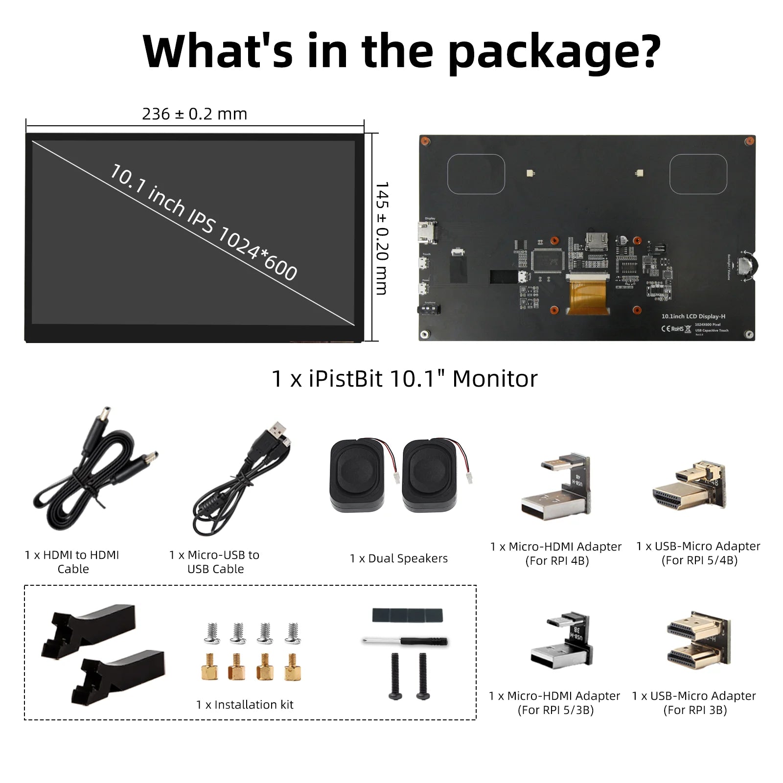10.1 inch Capacitive Touchscreen,IPS 1024×600, Dual Built-in Speakers, HDMI Monitor Compatible with Raspberry Pi