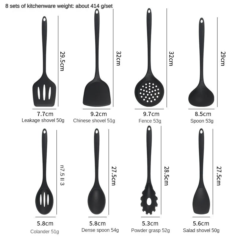 8ps Household black Silicone kitchenware 8-piece set of Chinese spaghetti spoon salad spaghetti spaghetti spaghetti,Rice spoon,