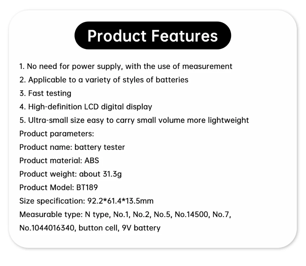 Tested type: N type, 1 #, 2 #, 5 #, 14500, 7 #, 1044016340, button battery, 9V battery