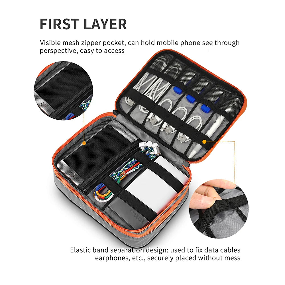 Keep your cables and digital accessories neatly organized with this cable storage bag featuring a double-layered design ideal for data cables, earphones, USB drives, SD cards, power banks, mice, chargers, and more. Made from waterproof polyester fabric, it protects your gadgets from splashes and rain, making it perfect for travel and daily use.