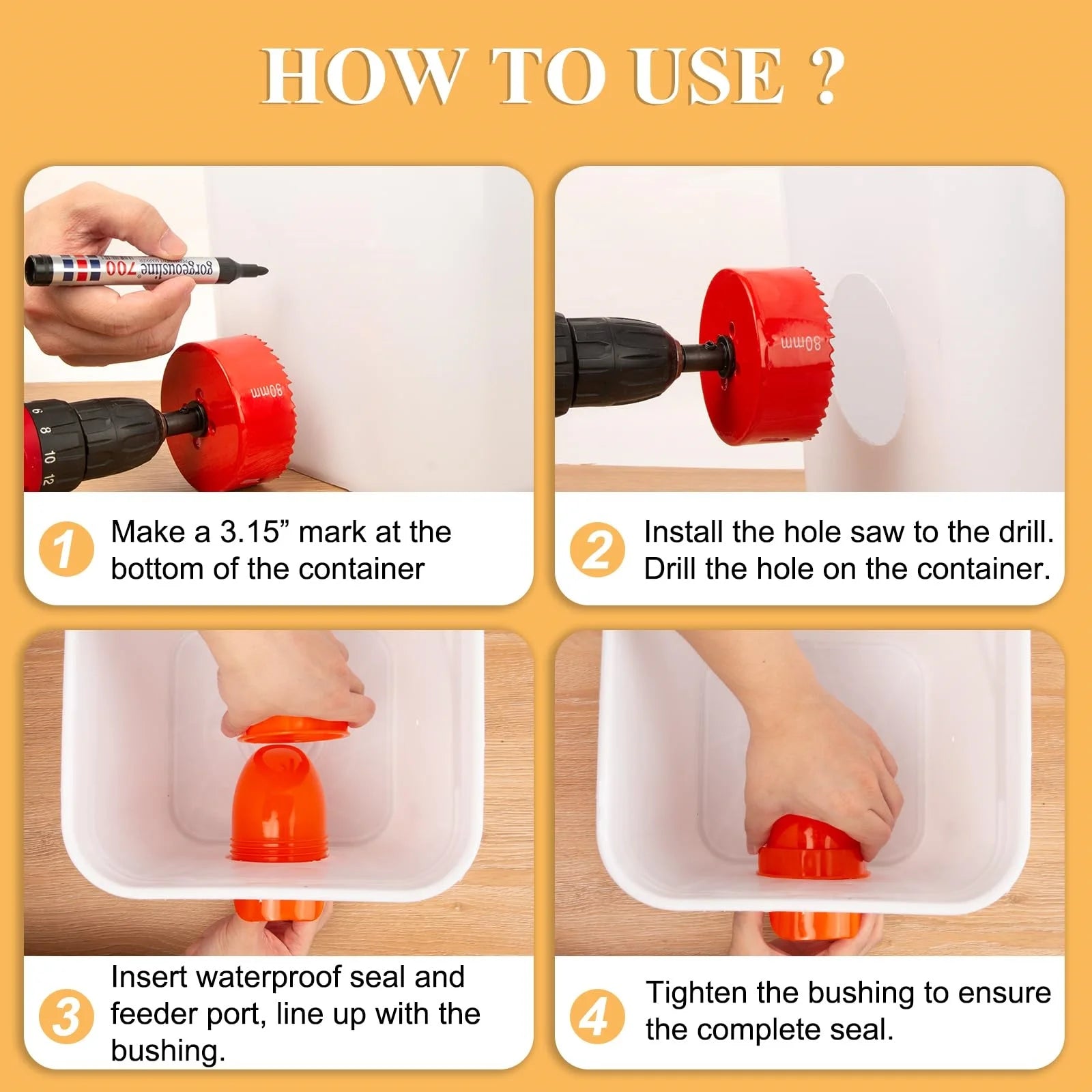 Feed your flock efficiently with this DIY chicken feeder port kit, a rainproof and mess-free solution designed for use with buckets, barrels, and bins. Using gravity-fed flow, this system minimizes waste and keeps feed dry even in wet weather.